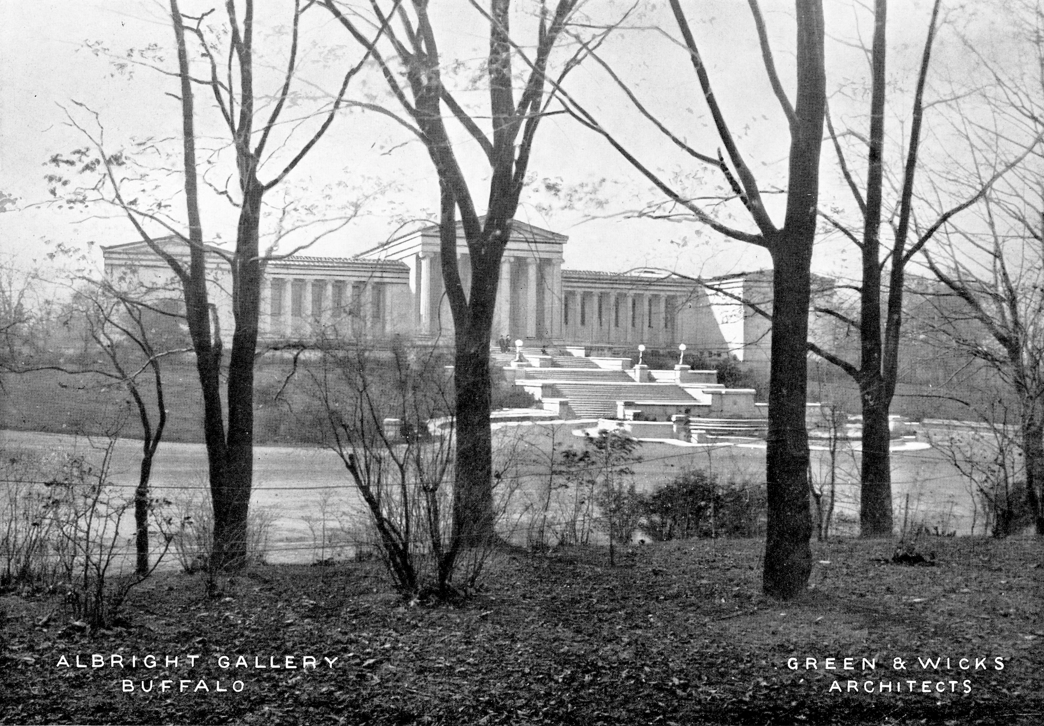 → When John J. Albright commissioned his favorite architect, Edward B. Green, to create a fine arts pavilion for the 1901 Pan-American Exposition — and to serve thereafter as the home of the Buffalo Fine Arts Academy (BFAA) — Green determined to recreate a Greek temple as closely as possible. Green and his partners at the firm Green & Wicks didn’t get the project done on time: they missed the fair by four years. You may say that the building wasn’t completed until the 1930s when the caryatids were finally added, or you might admit that buildings are constantly evolving over time. Either way, Green’s neoclassical edifice was novel in its use of overhead lighting and profusion of columns — more than any building outside the United States Capitol — but it wasn’t particularly novel in its aesthetics. Neoclassicism in architecture seems to have lasted forever — it was in vogue from the creation of the first art museums in the late eighteenth century until the early twentieth — and while there was some differentiation over time, much of it came down to which classical architecture was the point of reference: Roman or Greek?