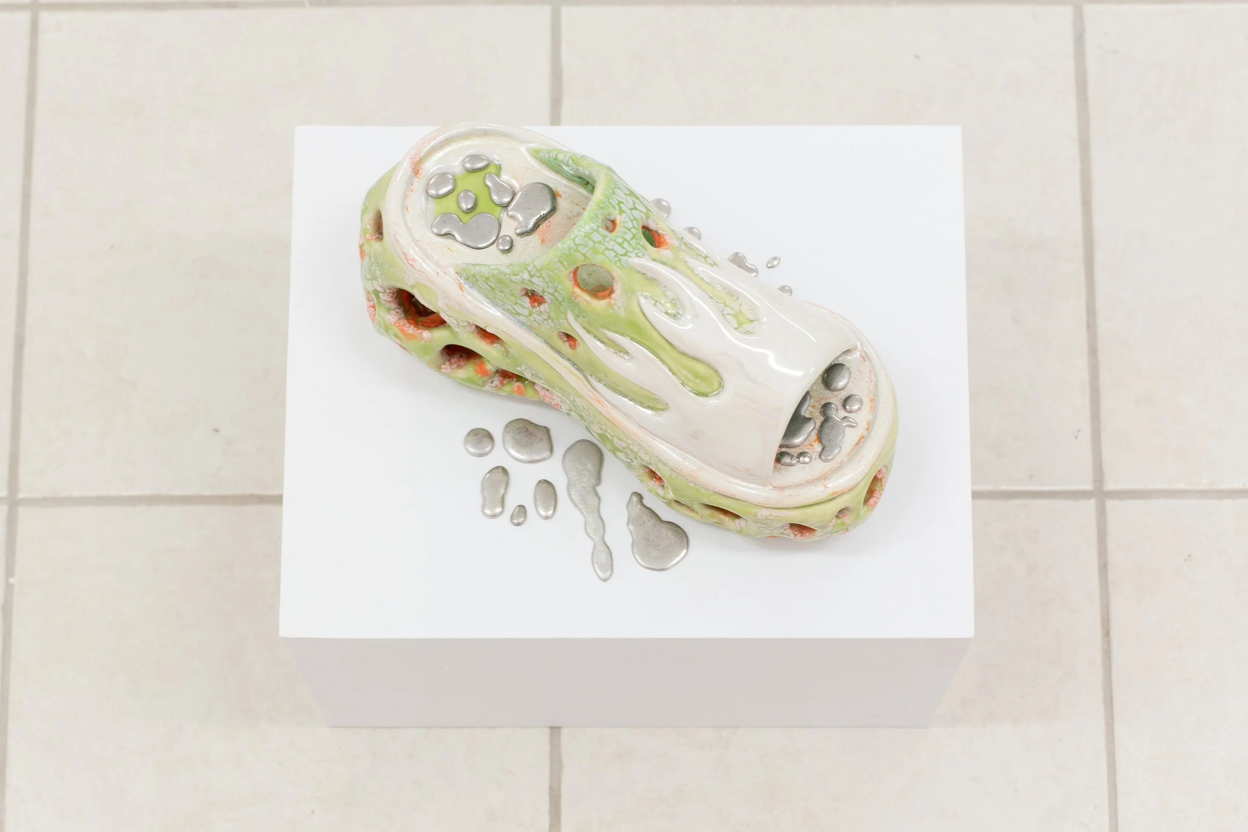 Kaley Flowers, wedge drip melt slip, 2021. Ceramic, glaze, lustre, metal, epoxy, ash, 11.5 x 4.5 x 6 inches. Courtesy of the artist and the plumb. Photo: Alison Postma.