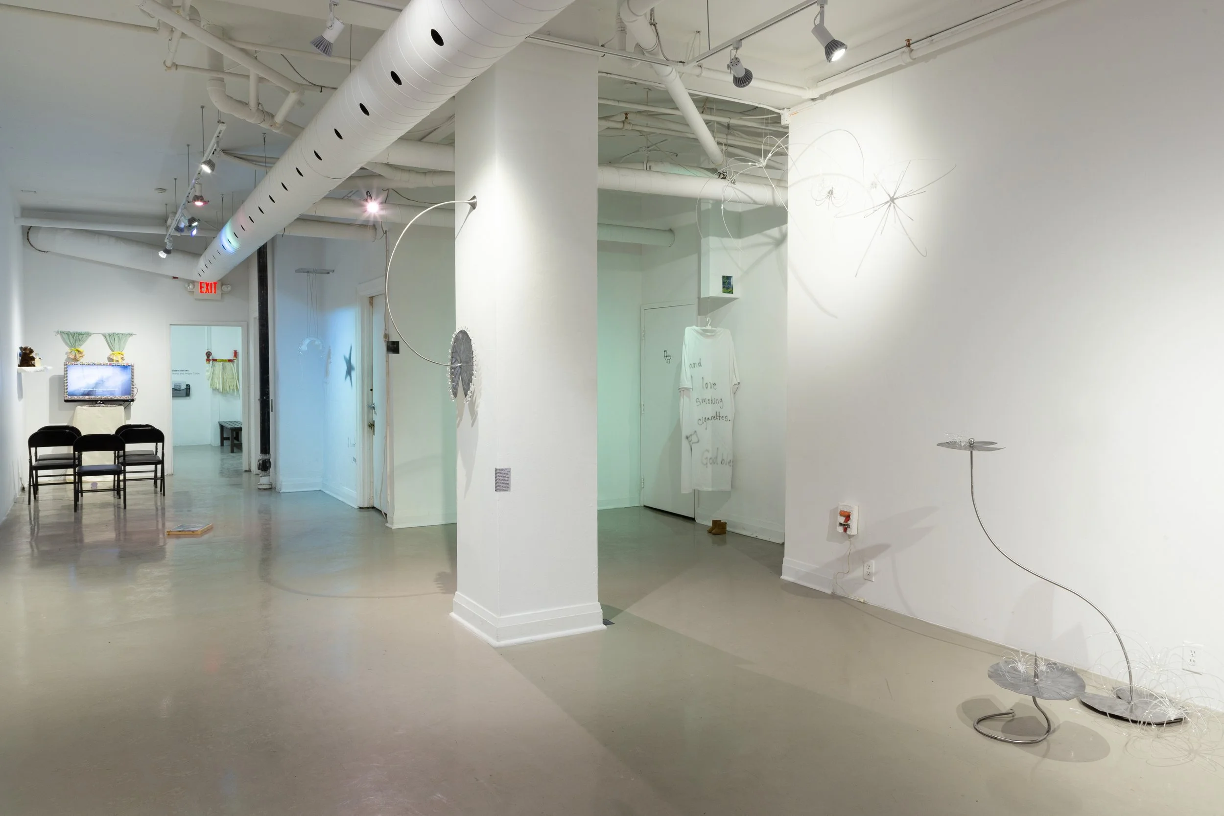 This distortion present across the PLSDONT’s studio space is reflective of a deep existential confusion. I am sympathetic—to be disgruntled is the prerogative of the young, and I prepare to be punched in the face by their rage and grief and to feel the anarchy of their estrangement. But the show is less the howl of a bastard son and more the static-y radio transmissions of a baby monitor, a humdrum proof of life. The art—which evidently situates itself within an “Internet culture” whose distinction from “culture” grows waterier week by week—captures something substantive about what it means to be alive and online right now. But these transmissions lack the clarity to express anything acute. “To laugh is to take down an authority,” declares the curatorial statement, which may not be true, but neither is it misguided—the collective humor is a welcome shred of vitality within the atmosphere of self-defeat and obsolescence.