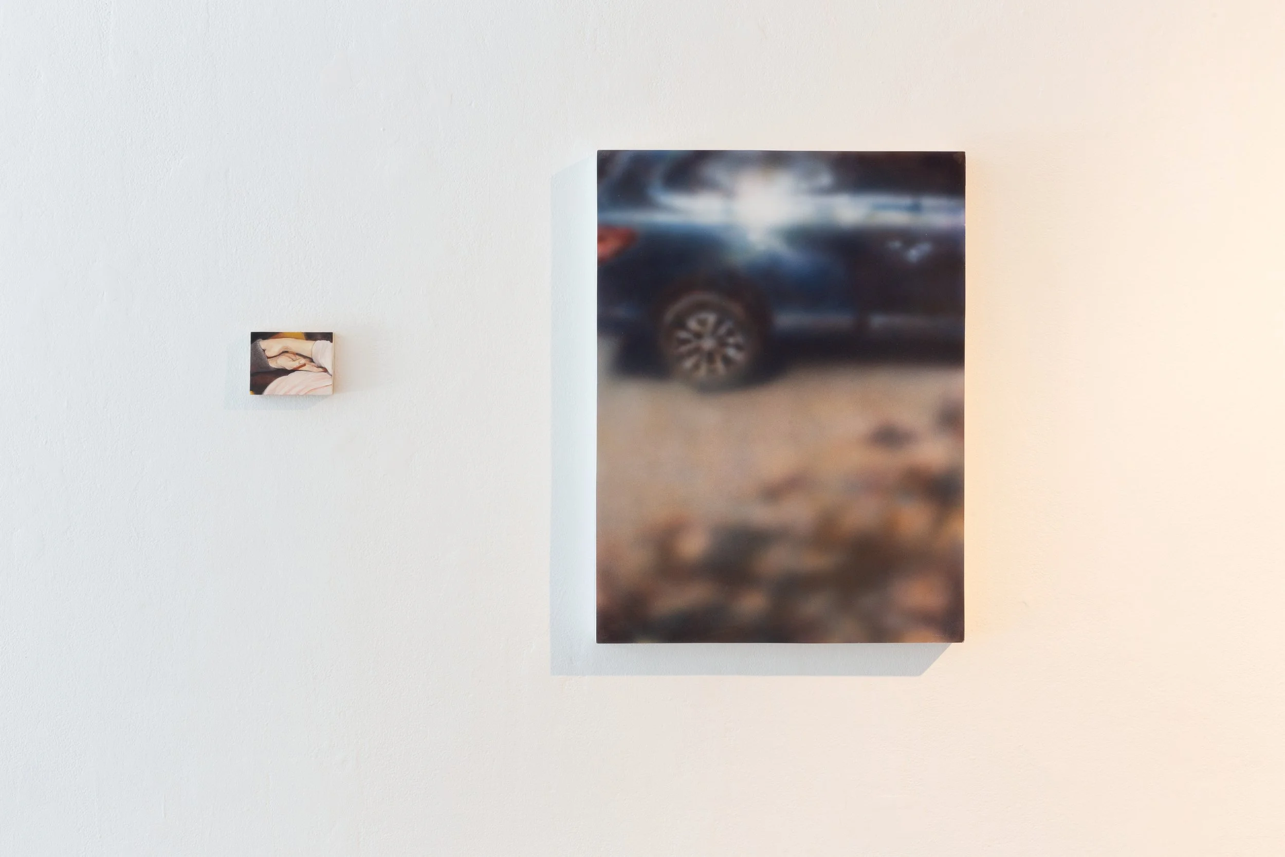 Jake Santos’s texture, a filter that offsets his otherwise faithfully photorealist renditions, is his saving grace. Connective Tissue, a show I catch at Xpace over the weekend, includes his painting take care (2025). Here, Santos forgoes his usual intimate portraiture for an off-center shot of a car; the sun that bounces off its windows is more distinct and radiant than the object itself. Neither the subject nor the commodity is the central concern; instead, it is light, the kind that bursts through the lens and obscures the clarity of a photograph. The sumptuous texture cleverly evokes the long-fetishized grain of analog media, the direction in which cyber-aesthetics seem to be floating as well.